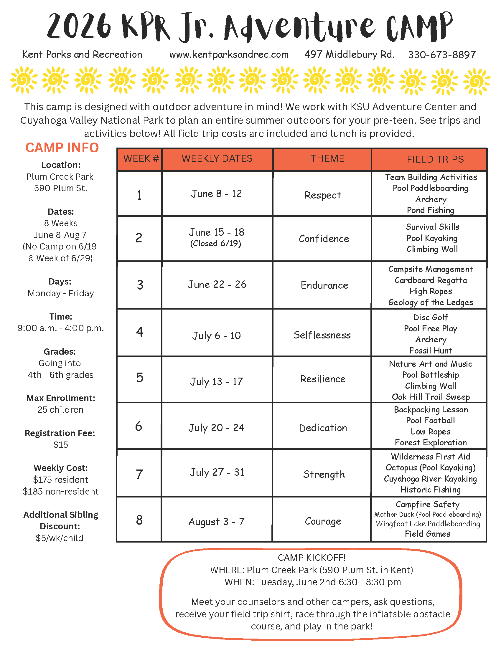 | 1 | June 8-12 | Respect | Team Building, Pool Paddleboarding, Archery, & Pond Fishing |