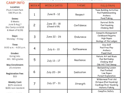 | 7 | July 27-31 | Strength | Wilderness First Aid, Octopus Pool Kayaking, Cuyahoga River Kayaking, Historic Fishing |