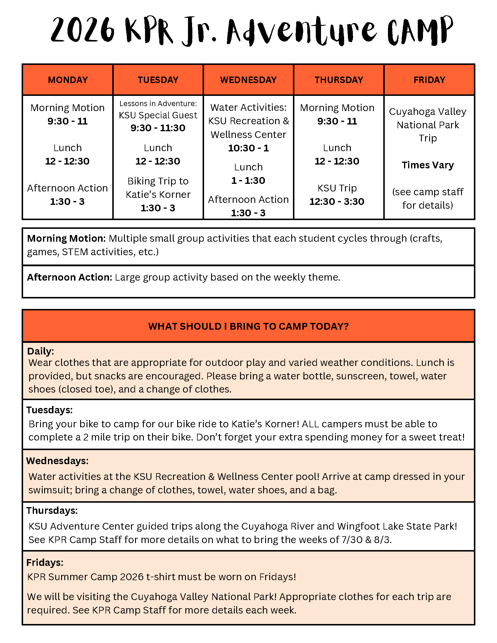 What to Bring: Campers are expected to come to camp on Friday wearing their camp shirt. Check in each week with camp staff for additional information regarding the CVNP field trip and if there are any special requirements.